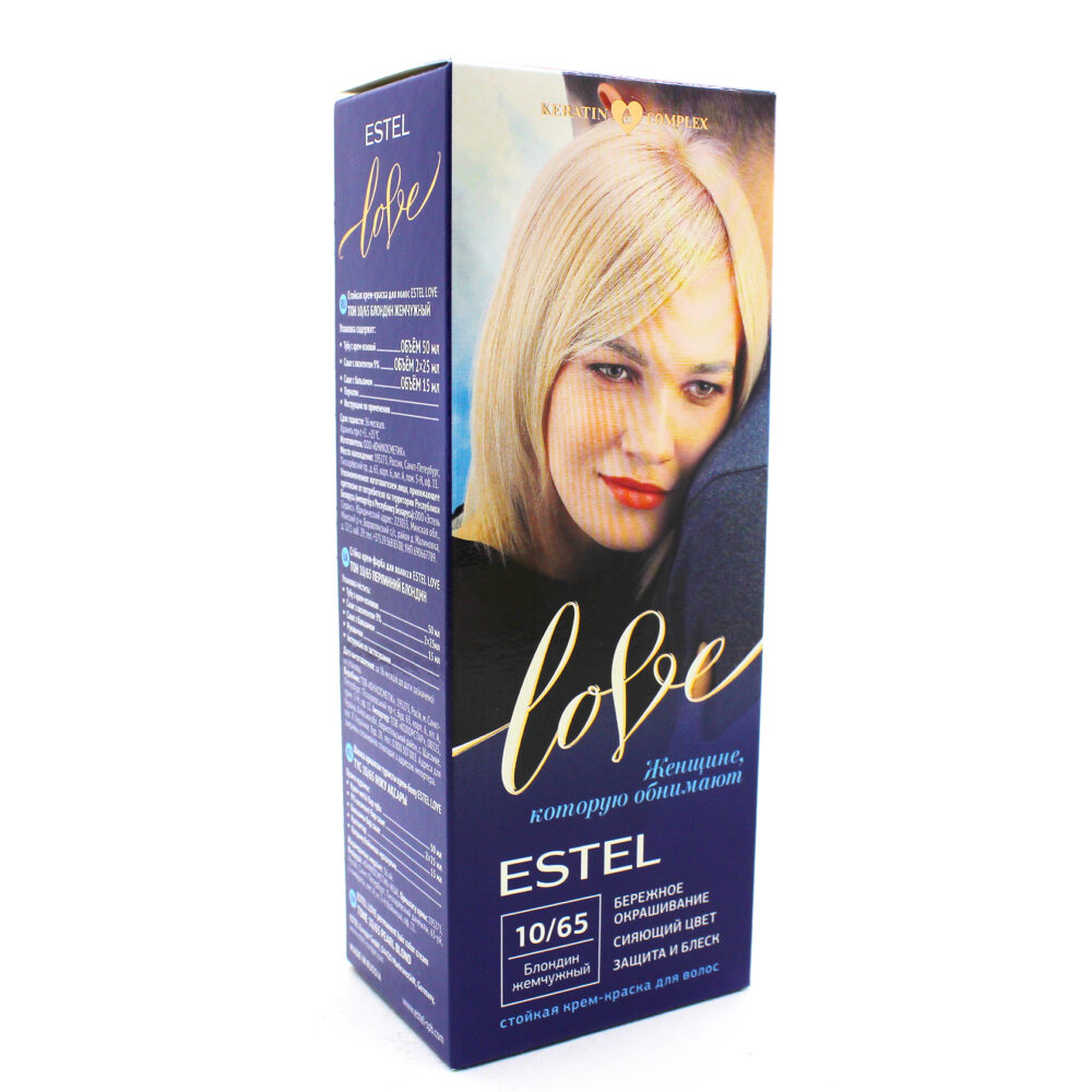 Стойкая крем-краска Estel Love : 10/65 Блондин жемчужный. Описание: Максимально мягкое воздействие на структуру волос. Компоненты краски обеспечивают бережное окрашивание и превосходный уход. Обогащённая натуральными компонентами - маслом иланг-иланга и пчелиным воском - формула гарантирует качественный уход, равномерное нанесение и 100% закрашивание седины. В результате волосы приобретают жизненую силу и глубокий цвет. Бережная защита от внешних факторов и кристальный блеск. Содержимое: - Туба с крем-основой - Саше с оксигентом 6% - Саше с бальзамом - Перчатки - Инструкция по применению