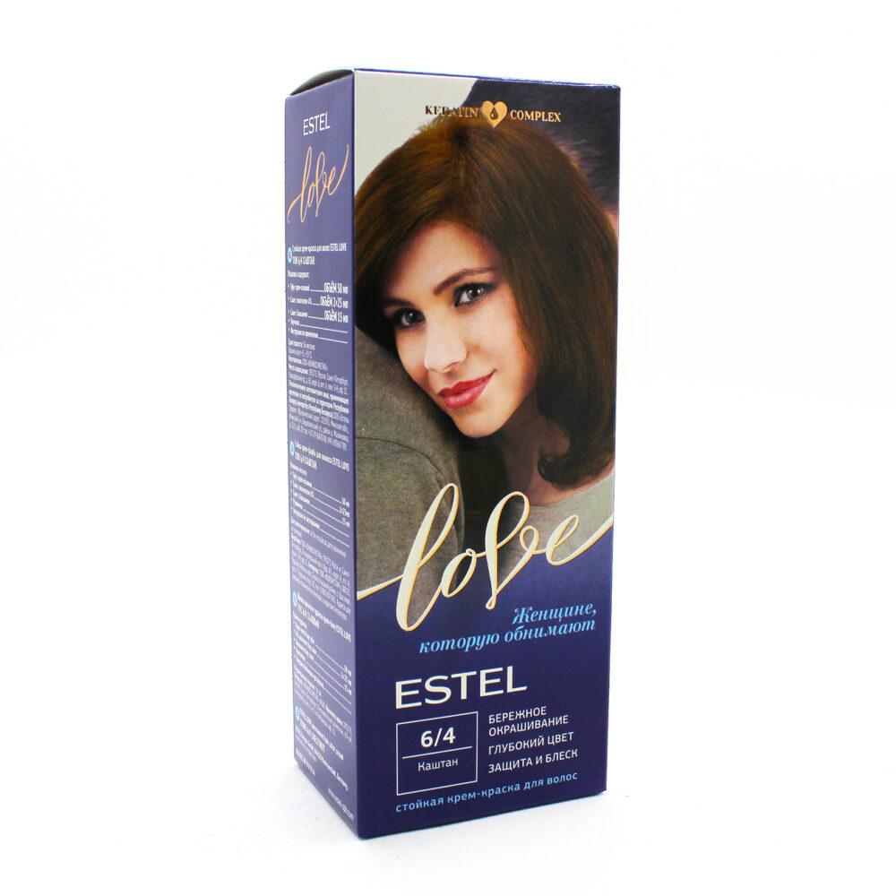 Стойкая крем-краска Estel Love : 6/4 Каштан. Описание: Максимально мягкое воздействие на структуру волос. Компоненты краски обеспечивают бережное окрашивание и превосходный уход. Обогащённая натуральными компонентами - маслом иланг-иланга и пчелиным воском - формула гарантирует качественный уход, равномерное нанесение и 100% закрашивание седины. В результате волосы приобретают жизненую силу и глубокий цвет. Бережная защита от внешних факторов и кристальный блеск. Содержимое: - Туба с крем-основой - Саше с оксигентом 6% - Саше с бальзамом - Перчатки - Инструкция по применению