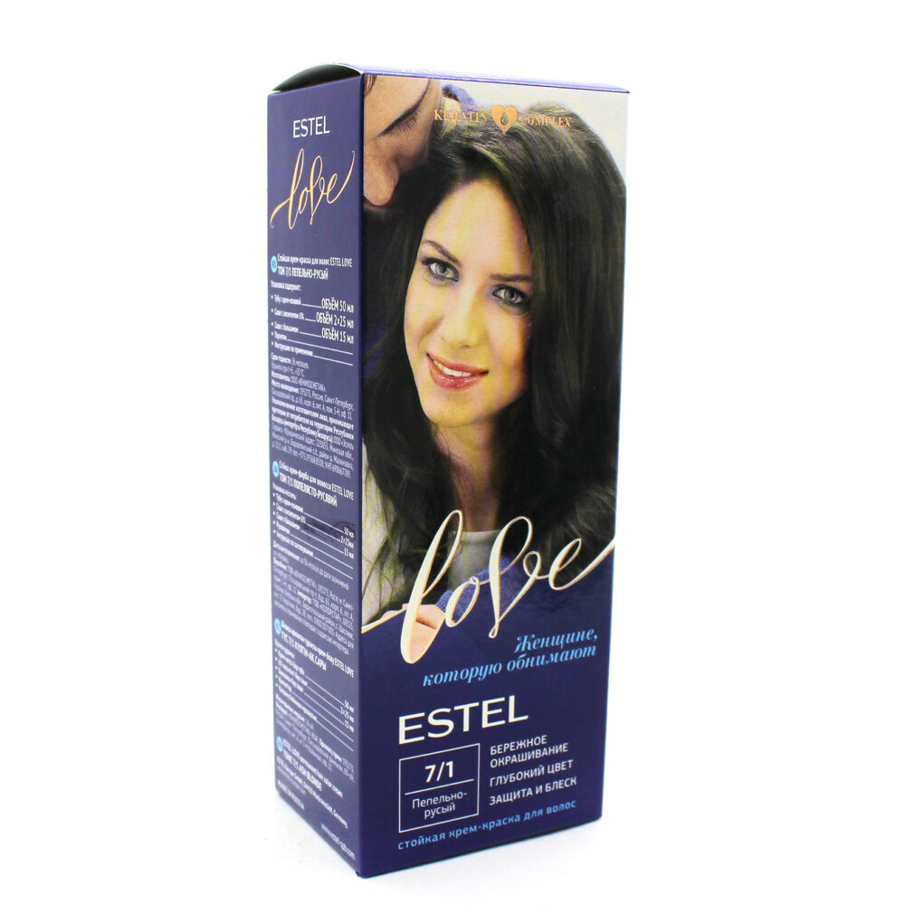 Стойкая крем-краска Estel Love : 7/1 Пепельно-русый. Описание: Максимально мягкое воздействие на структуру волос. Компоненты краски обеспечивают бережное окрашивание и превосходный уход. Обогащённая натуральными компонентами - маслом иланг-иланга и пчелиным воском - формула гарантирует качественный уход, равномерное нанесение и 100% закрашивание седины. В результате волосы приобретают жизненую силу и глубокий цвет. Бережная защита от внешних факторов и кристальный блеск. Содержимое: - Туба с крем-основой - Саше с оксигентом 6% - Саше с бальзамом - Перчатки - Инструкция по применению