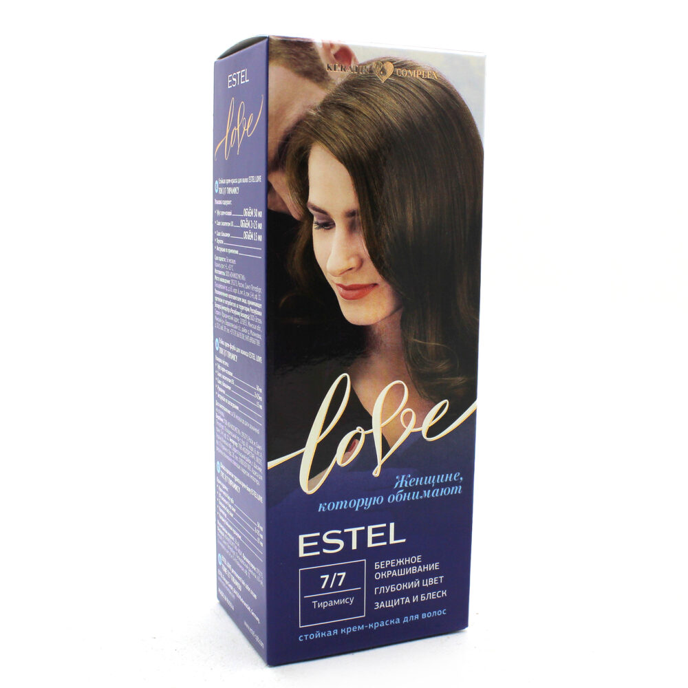 Стойкая крем-краска Estel Love : 7/7 Тирамису. Описание: Максимально мягкое воздействие на структуру волос. Компоненты краски обеспечивают бережное окрашивание и превосходный уход. Обогащённая натуральными компонентами - маслом иланг-иланга и пчелиным воском - формула гарантирует качественный уход, равномерное нанесение и 100% закрашивание седины. В результате волосы приобретают жизненую силу и глубокий цвет. Бережная защита от внешних факторов и кристальный блеск. Содержимое: - Туба с крем-основой - Саше с оксигентом 6% - Саше с бальзамом - Перчатки - Инструкция по применению