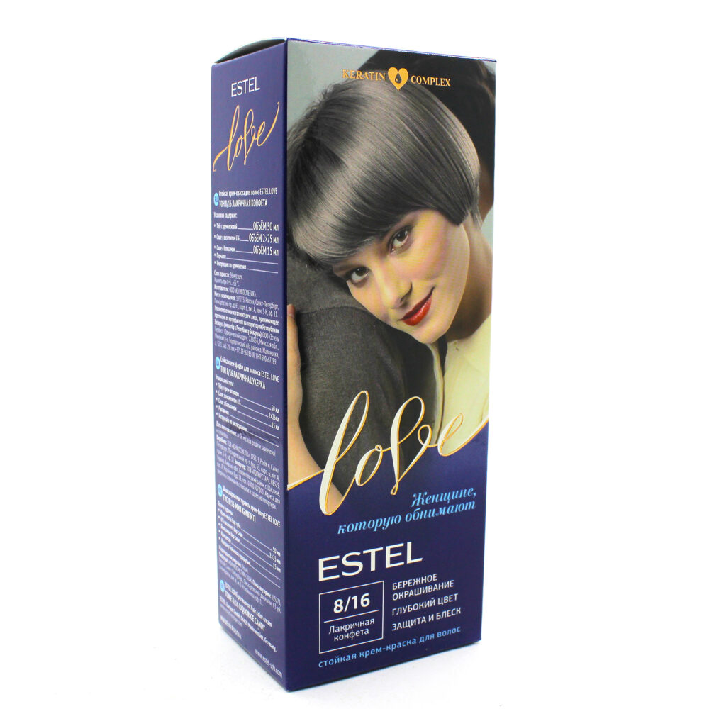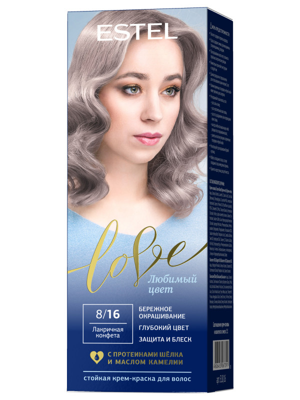 Стойкая крем-краска Estel Love : 8/16 Лакричная конфета. Описание: Максимально мягкое воздействие на структуру волос. Компоненты краски обеспечивают бережное окрашивание и превосходный уход. Обогащённая натуральными компонентами - маслом иланг-иланга и пчелиным воском - формула гарантирует качественный уход, равномерное нанесение и 100% закрашивание седины. В результате волосы приобретают жизненую силу и глубокий цвет. Бережная защита от внешних факторов и кристальный блеск. Содержимое: - Туба с крем-основой - Саше с оксигентом 6% - Саше с бальзамом - Перчатки - Инструкция по применению