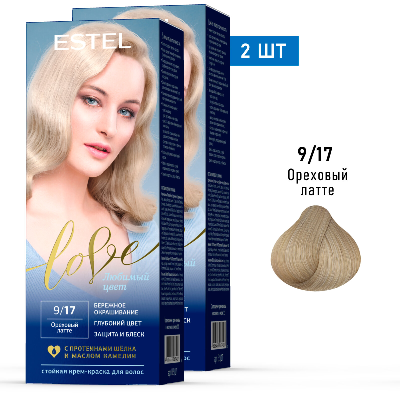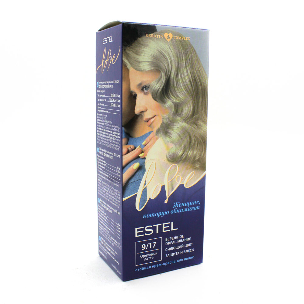Стойкая крем-краска Estel Love : 9/17 Ореховый латте. Описание: Максимально мягкое воздействие на структуру волос. Компоненты краски обеспечивают бережное окрашивание и превосходный уход. Обогащённая натуральными компонентами - маслом иланг-иланга и пчелиным воском - формула гарантирует качественный уход, равномерное нанесение и 100% закрашивание седины. В результате волосы приобретают жизненую силу и глубокий цвет. Бережная защита от внешних факторов и кристальный блеск. Содержимое: - Туба с крем-основой - Саше с оксигентом 6% - Саше с бальзамом - Перчатки - Инструкция по применению