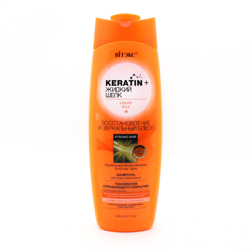 Шампунь "Витекс KERATIN+ Жидкий шёлк" подходит для ежедневного применения, он не вызывает зуда и раздражения, хорошо пенится и промывает волосы и кожу головы, восстанавливает повреждённые волосы, придаёт им здоровый красивый блеск, гладкость и эластичность. Шампунь содержит ряд полезных компонентов: Кератин и жидкий шёлк наполняют волосы жизненной энергией, восстанавливают структуру волос, придают им блеск и яркость цвета. Уникальный комплекс Glossyliance, в состав которого входят экстракт сахарного тростника и корня лимона, заметно увеличивает блеск волос, разглаживает чешуйки и придаёт волосам мягкость (эффективность доказана французской компанией Soliance).