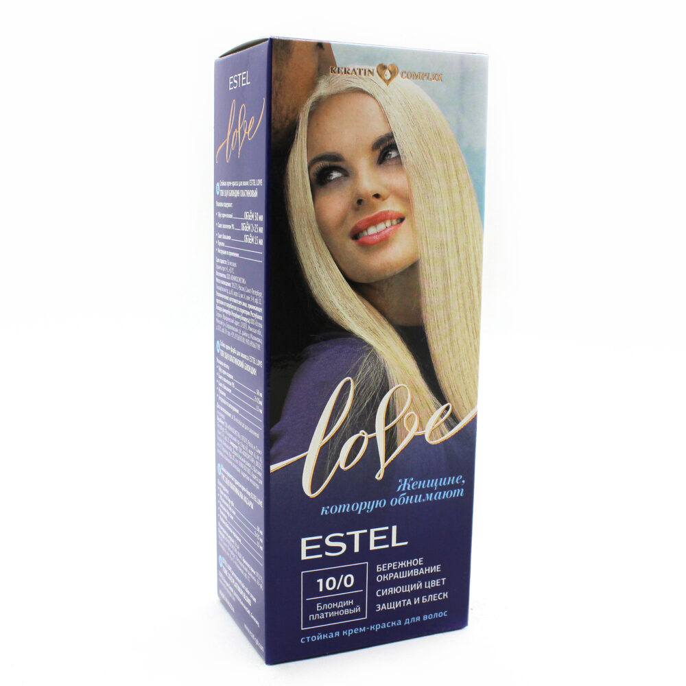 Стойкая крем-краска Estel Love : 10/0 Блондин платиновый. Описание: Максимально мягкое воздействие на структуру волос. Компоненты краски обеспечивают бережное окрашивание и превосходный уход. Обогащённая натуральными компонентами - маслом иланг-иланга и пчелиным воском - формула гарантирует качественный уход, равномерное нанесение и 100% закрашивание седины. В результате волосы приобретают жизненую силу и глубокий цвет. Бережная защита от внешних факторов и кристальный блеск. Содержимое: - Туба с крем-основой - Саше с оксигентом 6% - Саше с бальзамом - Перчатки - Инструкция по применению