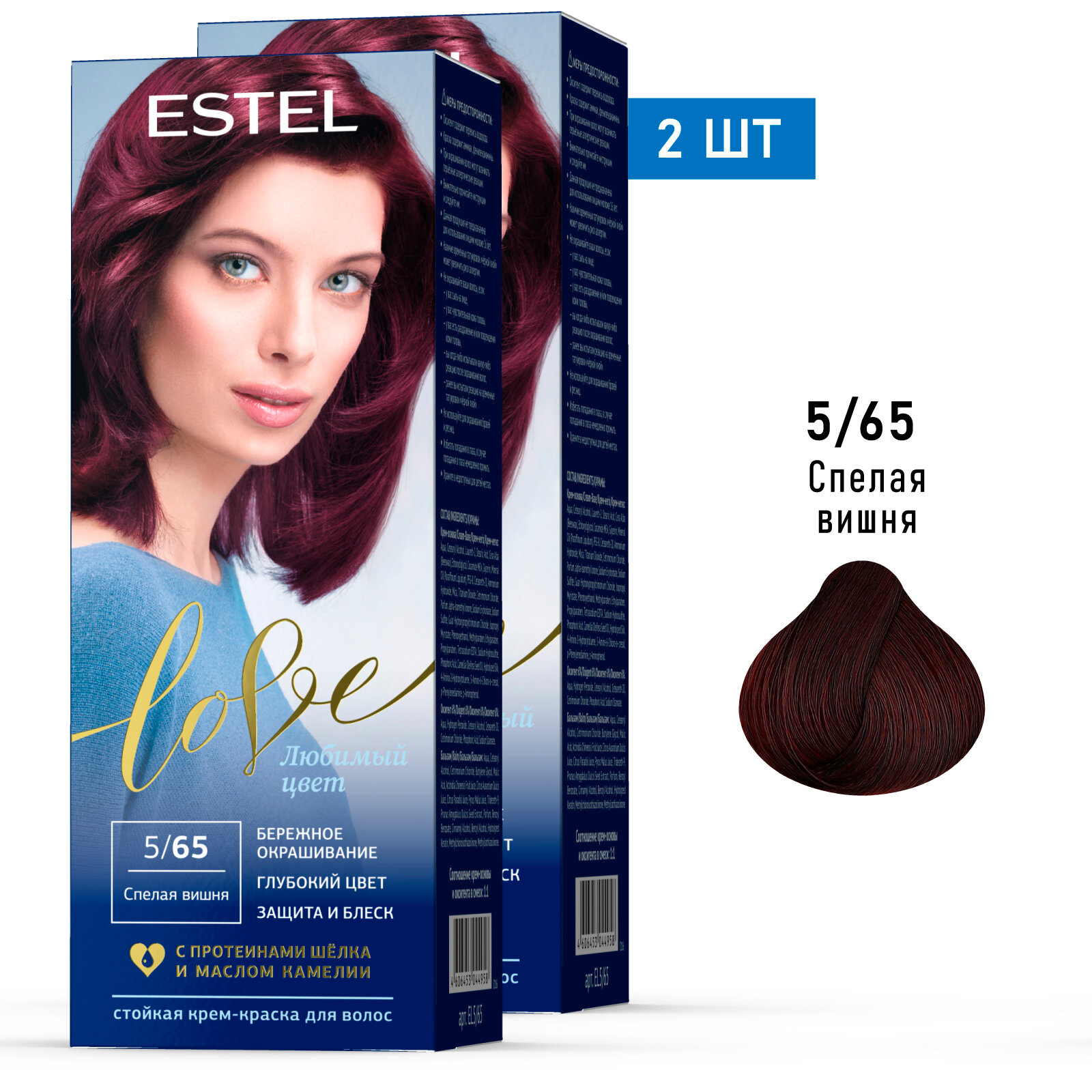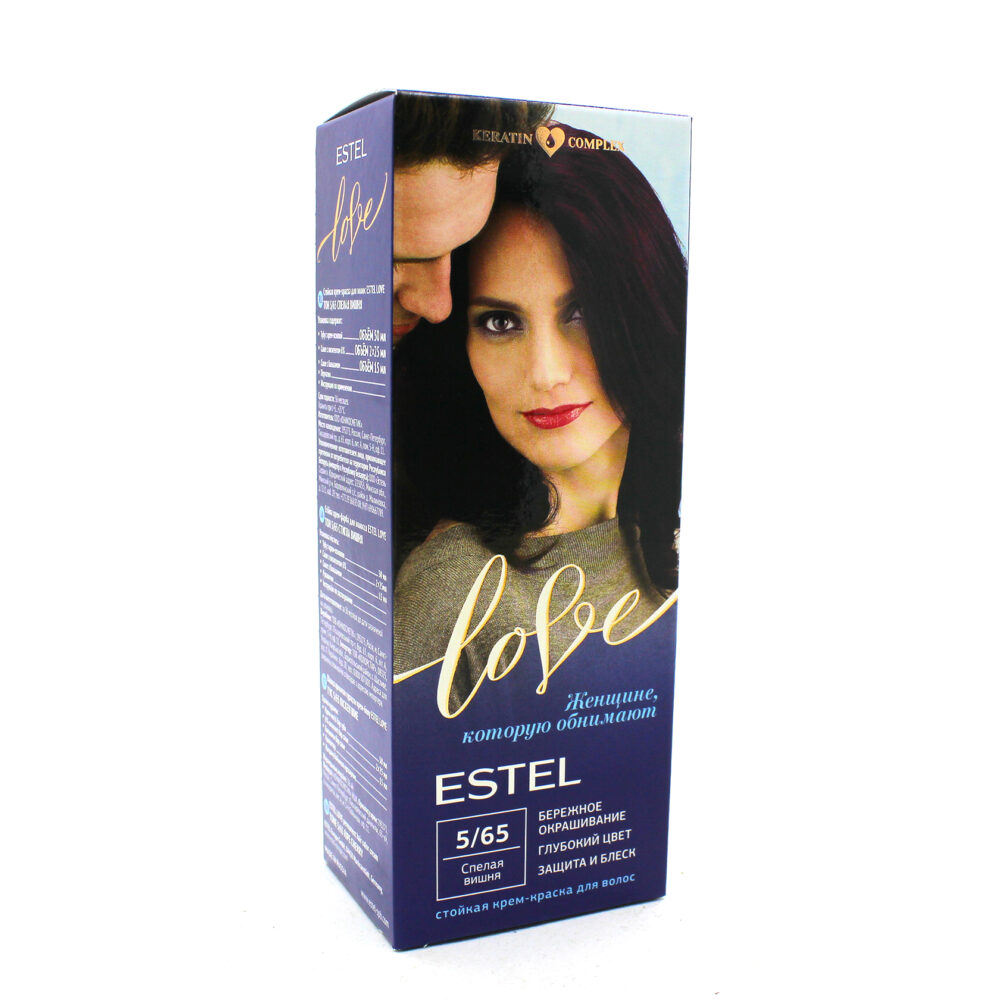 Стойкая крем-краска Estel Love : 5/65 Спелая вишня. Описание: Максимально мягкое воздействие на структуру волос. Компоненты краски обеспечивают бережное окрашивание и превосходный уход. Обогащённая натуральными компонентами - маслом иланг-иланга и пчелиным воском - формула гарантирует качественный уход, равномерное нанесение и 100% закрашивание седины. В результате волосы приобретают жизненую силу и глубокий цвет. Бережная защита от внешних факторов и кристальный блеск. Содержимое: - Туба с крем-основой - Саше с оксигентом 6% - Саше с бальзамом - Перчатки - Инструкция по применению