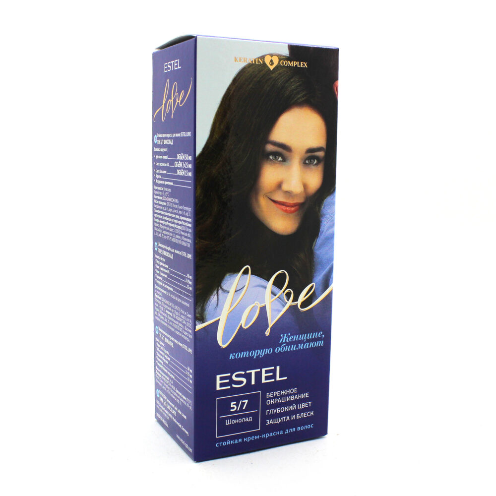 Стойкая крем-краска Estel Love : 5/7 Шоколад. Описание: Максимально мягкое воздействие на структуру волос. Компоненты краски обеспечивают бережное окрашивание и превосходный уход. Обогащённая натуральными компонентами - маслом иланг-иланга и пчелиным воском - формула гарантирует качественный уход, равномерное нанесение и 100% закрашивание седины. В результате волосы приобретают жизненую силу и глубокий цвет. Бережная защита от внешних факторов и кристальный блеск. Содержимое: - Туба с крем-основой - Саше с оксигентом 6% - Саше с бальзамом - Перчатки - Инструкция по применению