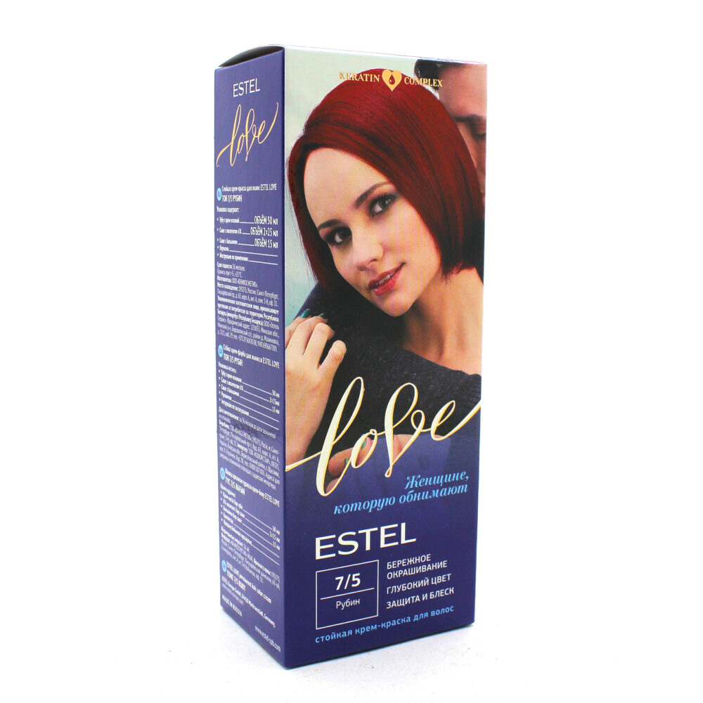Стойкая крем-краска Estel Love : 7/5 Рубин. Описание: Максимально мягкое воздействие на структуру волос. Компоненты краски обеспечивают бережное окрашивание и превосходный уход. Обогащённая натуральными компонентами - маслом иланг-иланга и пчелиным воском - формула гарантирует качественный уход, равномерное нанесение и 100% закрашивание седины. В результате волосы приобретают жизненую силу и глубокий цвет. Бережная защита от внешних факторов и кристальный блеск. Содержимое: - Туба с крем-основой - Саше с оксигентом 6% - Саше с бальзамом - Перчатки - Инструкция по применению