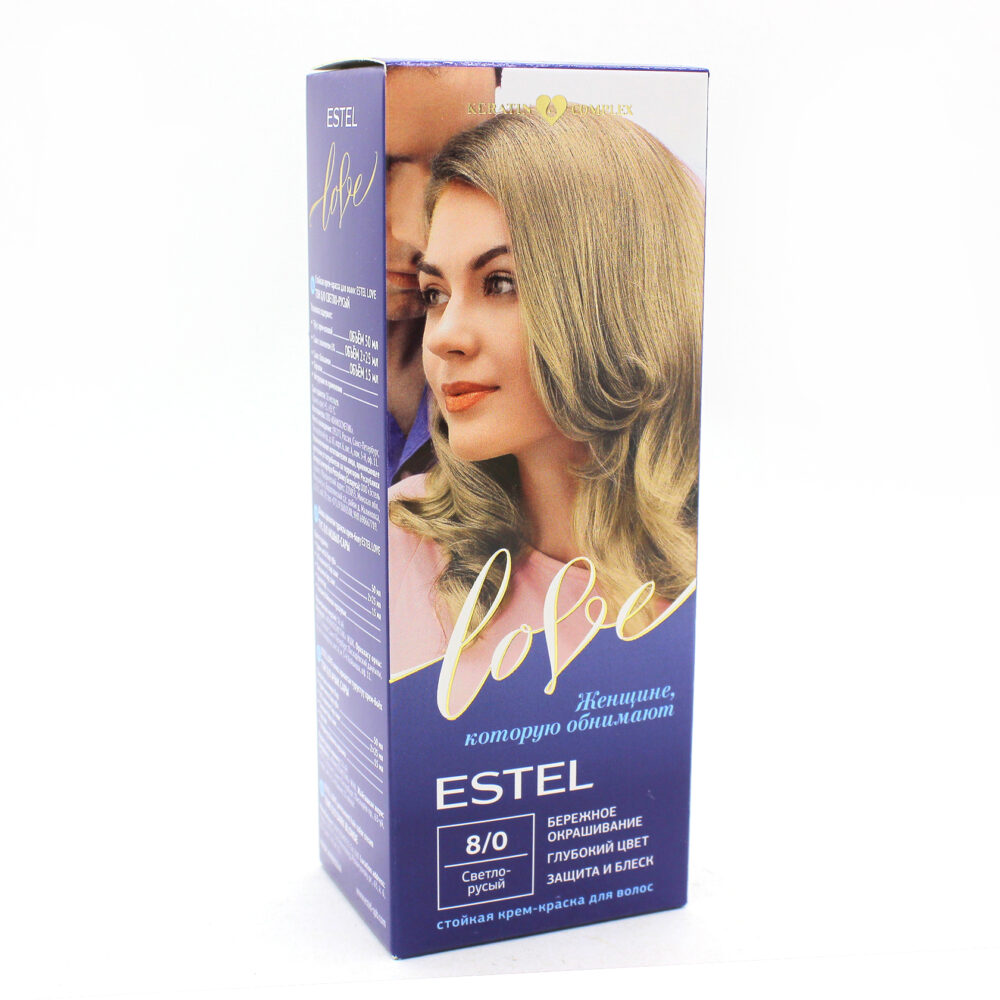 Стойкая крем-краска Estel Love : 8/0 Светло-русый. Описание: Максимально мягкое воздействие на структуру волос. Компоненты краски обеспечивают бережное окрашивание и превосходный уход. Обогащённая натуральными компонентами - маслом иланг-иланга и пчелиным воском - формула гарантирует качественный уход, равномерное нанесение и 100% закрашивание седины. В результате волосы приобретают жизненую силу и глубокий цвет. Бережная защита от внешних факторов и кристальный блеск. Содержимое: - Туба с крем-основой - Саше с оксигентом 6% - Саше с бальзамом - Перчатки - Инструкция по применению