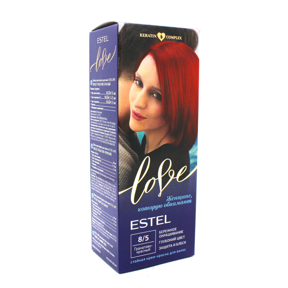 Стойкая крем-краска Estel Love : 8/5 Гранатово-красный. Описание: Максимально мягкое воздействие на структуру волос. Компоненты краски обеспечивают бережное окрашивание и превосходный уход. Обогащённая натуральными компонентами - маслом иланг-иланга и пчелиным воском - формула гарантирует качественный уход, равномерное нанесение и 100% закрашивание седины. В результате волосы приобретают жизненую силу и глубокий цвет. Бережная защита от внешних факторов и кристальный блеск. Содержимое: - Туба с крем-основой - Саше с оксигентом 6% - Саше с бальзамом - Перчатки - Инструкция по применению