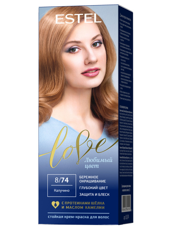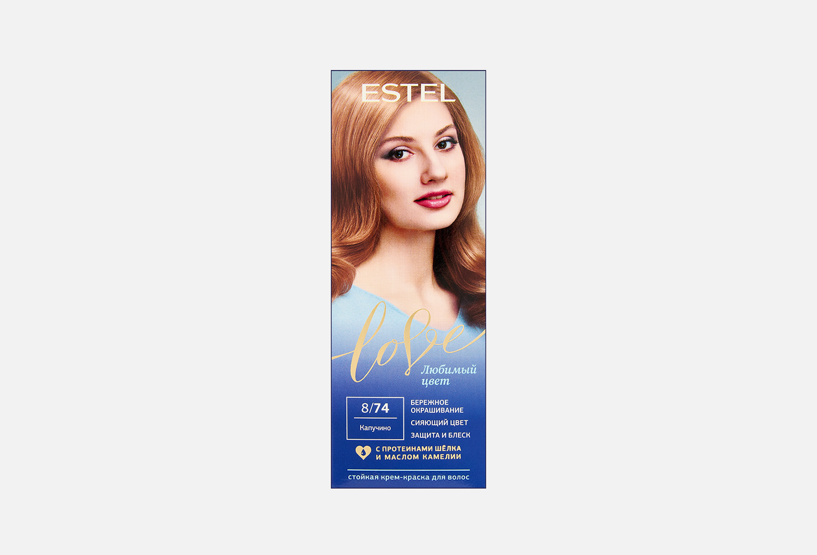 Стойкая крем-краска Estel Love : 8/74 Капучино. Описание: Максимально мягкое воздействие на структуру волос. Компоненты краски обеспечивают бережное окрашивание и превосходный уход. Обогащённая натуральными компонентами - маслом иланг-иланга и пчелиным воском - формула гарантирует качественный уход, равномерное нанесение и 100% закрашивание седины. В результате волосы приобретают жизненую силу и глубокий цвет. Бережная защита от внешних факторов и кристальный блеск. Содержимое: - Туба с крем-основой - Саше с оксигентом 6% - Саше с бальзамом - Перчатки - Инструкция по применению