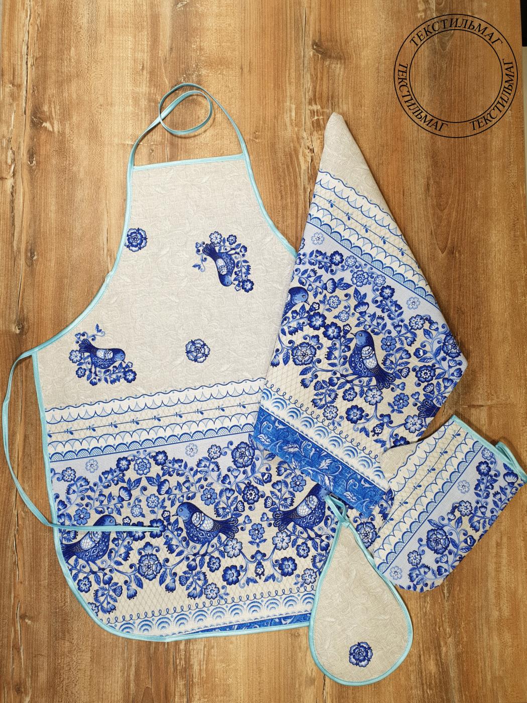 Комплект кухонный из рогожки 4 предмета: фартук, варежка, прихватка, полотенце (Гжель)